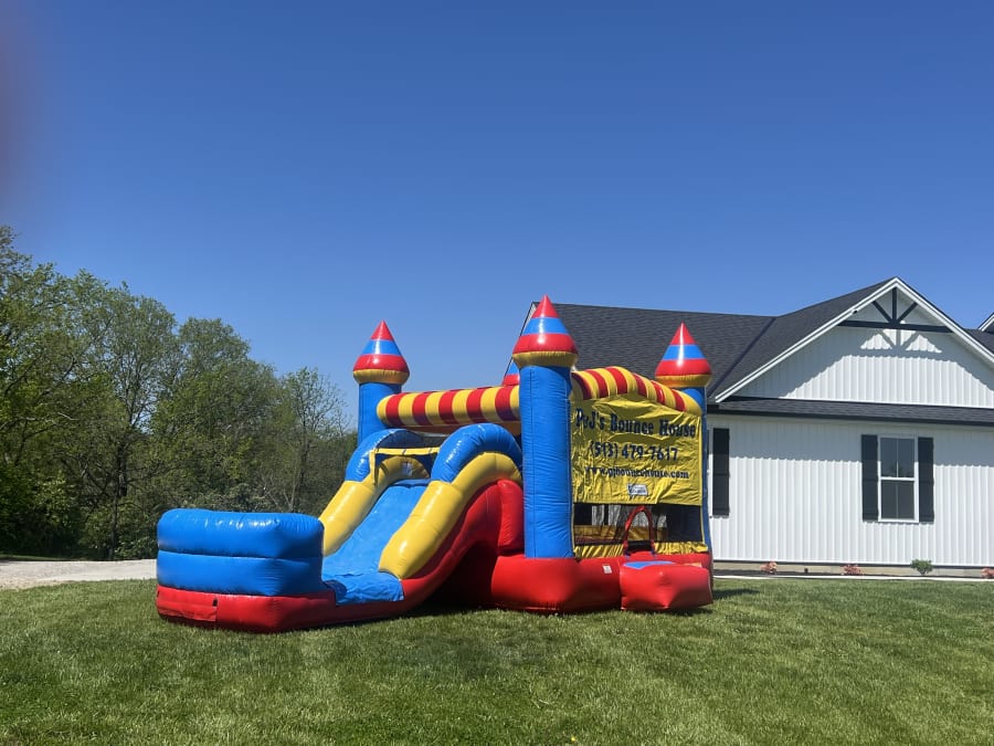 Dry Bounce House combo (5 in 1) Combo Waterslide Circus 🎪 in Glendale, Springdale, Mason, Liberty Township, Ross, Harrison, Oxford, Middletown, Lebanon, Loveland, Fairfield. Fast fun and bright design. The (5 in 1) Combo Waterslide Circus 🎪 is a single-lane bounce house combo built for active kids. It features a bounce area, basketball hoop, climbing zone and slide. Colors are gender-neutral red, yellow, and blue. Use wet or dry, though most renters choose dry. 🏃‍♂️🎈