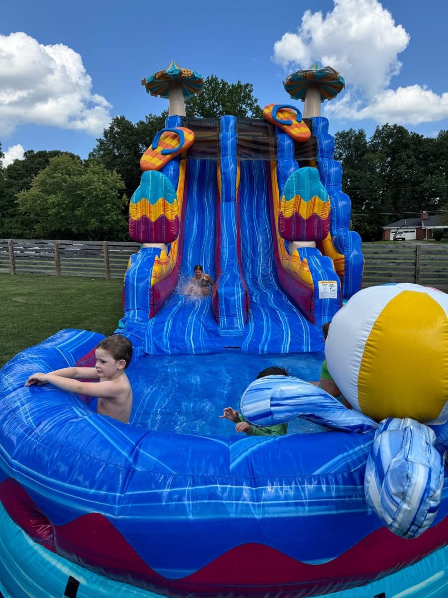 Birthday Parties 20ft Pool Party Dual Lane Water Slide in Springsboro, Centerville, Lebanon, Mason, West Chester, Loveland, Monroe, Fairfield, Fairfield Township, Liberty Township, Blue Ash brings backyard excitement to your next celebration. This 20ft dual lane waterslide features a colorful pool-party theme with flip flops, beach balls, and ice cream/popsicle graphics. It’s gender neutral and built for all ages — kids and adults alike will love the rush. 💦