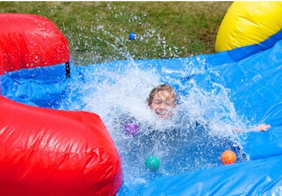 This inflatable’s compact design allows for easy setup and teardown. Convert it to a wet bounce house slide combo by simply connecting any garden hose to the misting system. Safety netting prevents kids from standing up and jumping from the top while ensuring that kids can slide down securely.