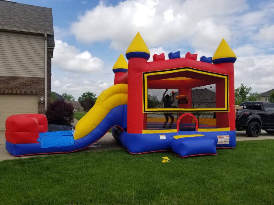 This is a beautiful and fun bounce and slide combo that includes a moonwalk and a waterslide, plus plenty of other features! Rent our basketball waterslide combo in Cincinnati, Dayton, Hamilton, Mason and surrounding areas; just use the reservation system on our website.